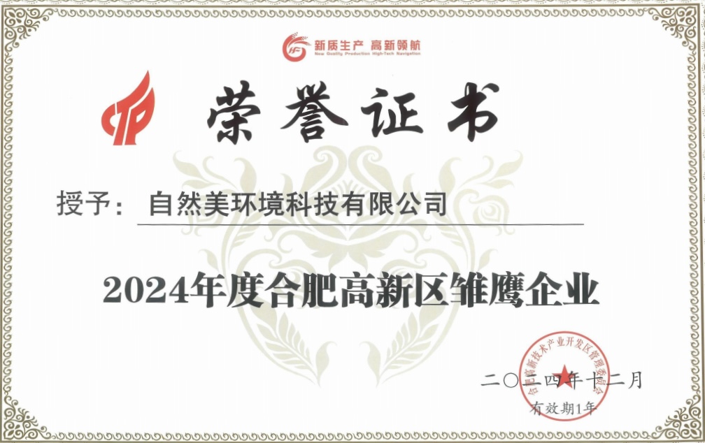 近日,自然美環境科技有限公司傳來振奮人心的消息,公司順利通過了2024年國家高新技術企業的復審,同時榮獲合肥市高新區新質企業 “雛鷹企業” 的榮譽稱號!