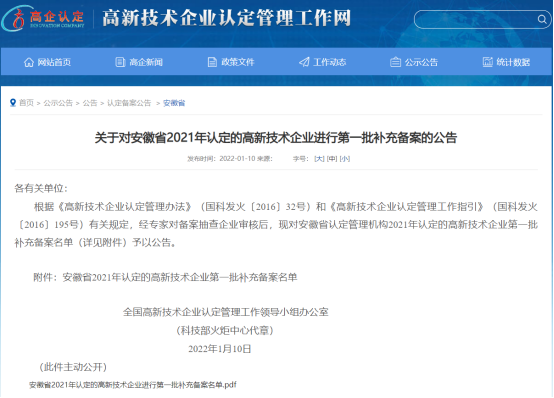 近日科技部發(fā)布了《關于對安徽省2021年認定的高新技術企業(yè)進行第一批補充備案的公告》安徽自然美環(huán)境科技有限公司榮獲“國家高新技術企業(yè)”。