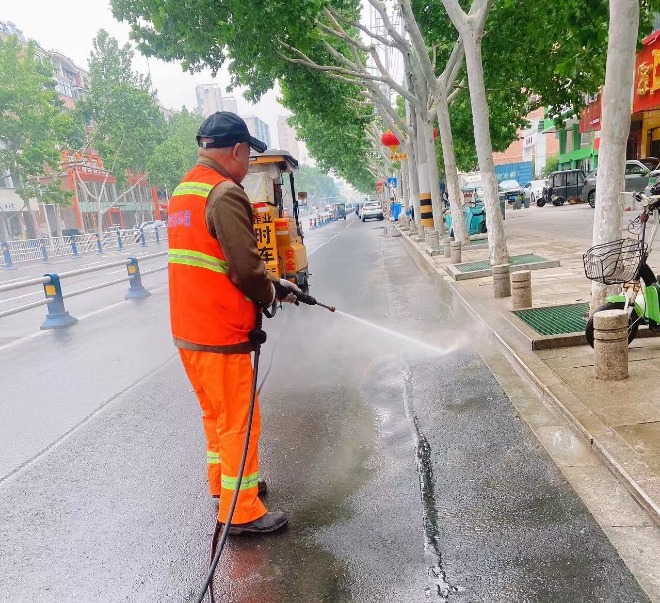 當暴雨終于露出停歇的間隙,環衛車隊已整裝待發。幾十余輛水車排成“作戰方陣”,高壓水槍如銀色巨龍般噴薄而出,將附著在路面的淤泥層層剝離。“要趕在淤泥干結前沖干凈!”隊長武姐拿著喇叭指揮作業,車輪碾過的地方,渾濁的泥水翻涌而起,露出原本的柏油路面。環衛工人們則手持長柄掃帚,在水槍后方“乘勝追擊”,將污水推向排水口。霎時間,阜城主干道已重現“本色”,濕漉漉的路面映著路燈,仿佛城市洗了個“舒爽澡”。